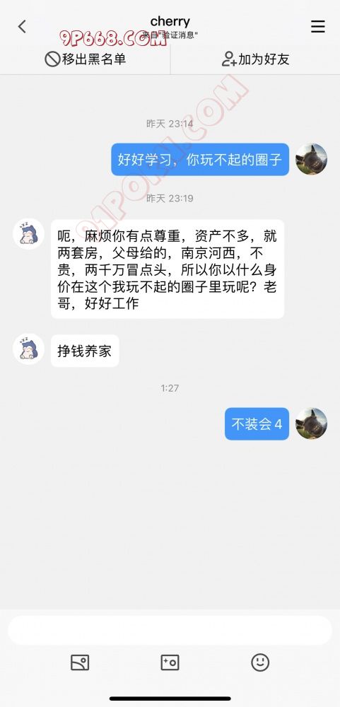 3、这屌丝还tmd来这装逼来了,父母给的两套房显得你能耐了?你tmd敢为妹子付出多少啊?还tmd河西房子,老子江湾城的房子是狗窝呗?老子高尔夫和百家湖的房子入不了你眼呗,真tmd能装大尾巴狼啊!这位兄弟这么牛逼还会缺女人么?还用得着当单男来舔么?任何人这条件,在南京找个妹子应该不是难事吧,所以。。。下头男!