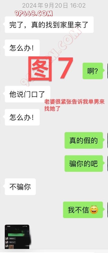 那天,单男发来信息给我说想过来问我方不方便,我告诉他没问题,叫他直接到小区里。碰面后,我交代了一些和老婆聊天和日常的内容以避免穿帮,让他登录上我的微信小号。然后让他直接上楼发消息告诉老婆过来看她了并且已经到门口了。因为我深知老婆的性格,虽然嘴上一直不同意,但是经过这半个月的热聊,最重要的是单男在这段时间在她身上花费了大量的金钱(不低于3000),让老婆有了一种吃人嘴软拿人手短的思想包袱,所以我断定,让单男直接上门老婆不会拒绝!单男到了小区给老婆发消息后,老婆马上发消息给我说那个人果然去找她了,问我怎么办?(见图7、8、9)