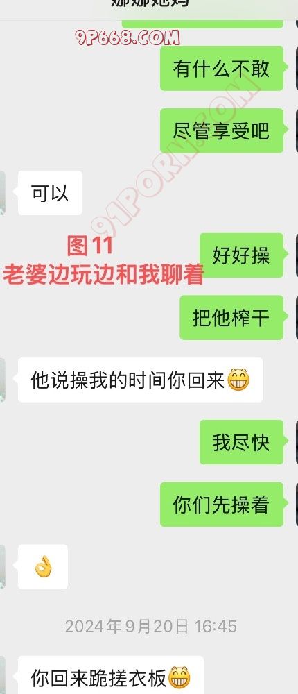 家里监控的视角正好对着沙发,所以我清晰的看着老婆一边打麻将,单男则坐在旁边一只手放在老婆大腿上,另一只手则伸进衣服里摸着老婆的大奶子。(这也是我事先和单男交代好的,老婆敏感度非常高,稍微一刺激就受不了,所以叫他一进房间就可以上手刺激老婆)。在这种情况下,很明显的看到老婆双腿一直糯动着,嘴里还一直叫单男停一下停一下之类,很明显她很想要了……由于当时没保存监控截图,所以这些画面就需要大家脑补了……终于在10几分钟后,老婆麻将结束了。刚好那时候我突然临时来了点小事处理了几分钟,处理好后赶紧重新打开监控,但他们已经消失在监控的视角里。不用想,他们已经是洗澡去了。果然,一会儿后,他们又重新回到监控里,然后进去了我们的卧室。因为我家监控只能拍到卧室里床尾一点地方,所以当他们进去后,我只能脑补画面了,但是当时这种感觉带给我的刺激不亚于前面9次的任何一次……我的老婆,正在和别的男人,在我的卧室,我的床上,发生着任何可能发生的事!而我正在小区停车场里坐在车里看着家里的监控!他们现在在干吗?是老婆在给他舔鸡巴?还是单男贪婪的抚摸着舔着老婆的大奶子?我脑海里想象着各种画面……没多久,老婆给我发来一条微信(见图10、11、12)。